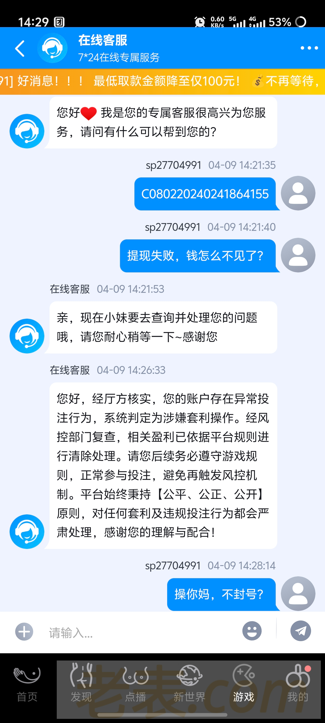 充值50下150不给,直接扣