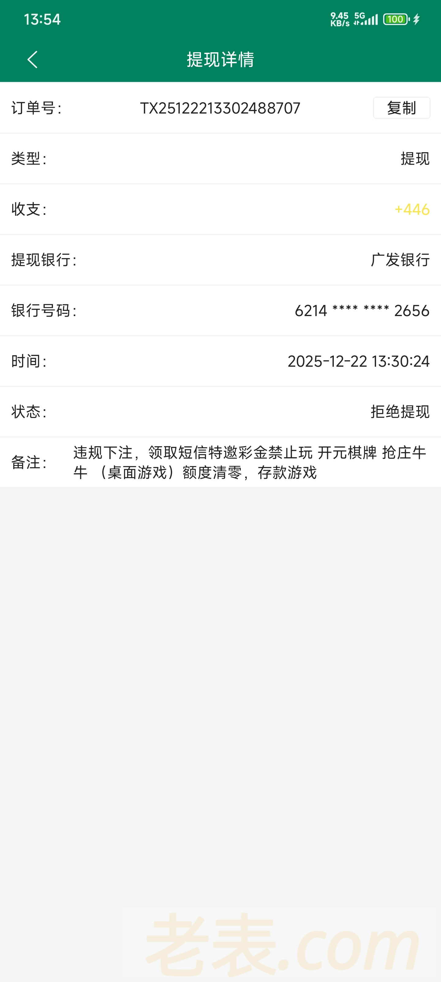 接到电话来的,然后注册送了28+15APP彩金,玩了开元牛牛和二八杠一直赢,满288提现到银行卡,我也绑卡了,后面赢到了400提现了,然后问客服提现进度说我违规下注说不能玩桌面游戏,我寻思着抢庄牛牛什么时候是桌面游戏了 桌面游戏不是龙虎斗百家乐红黑大战这些嘛?还让我存钱娱乐,送不起就别送了,吃相难看